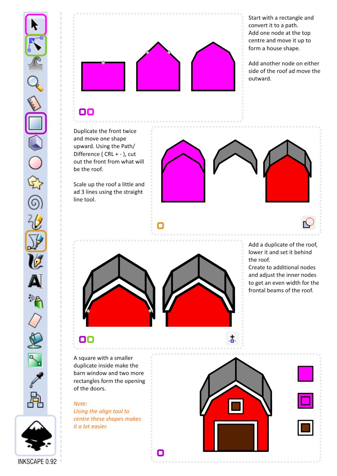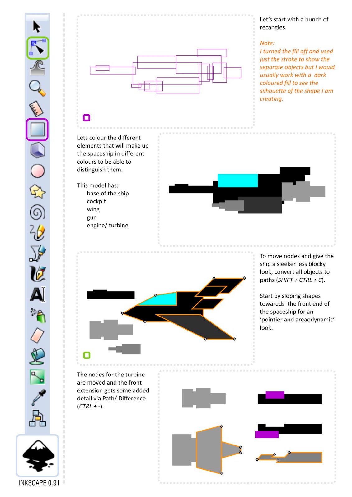 In order to avoid the editing pains and aches that come with complex shapes consisting of dozens and dozens of nodes, I tried a quick modular approach based on rectangles. Doing a rough shape with rectangles that give me an idea of the ships shape and then modifying those simple paths with the node tool.