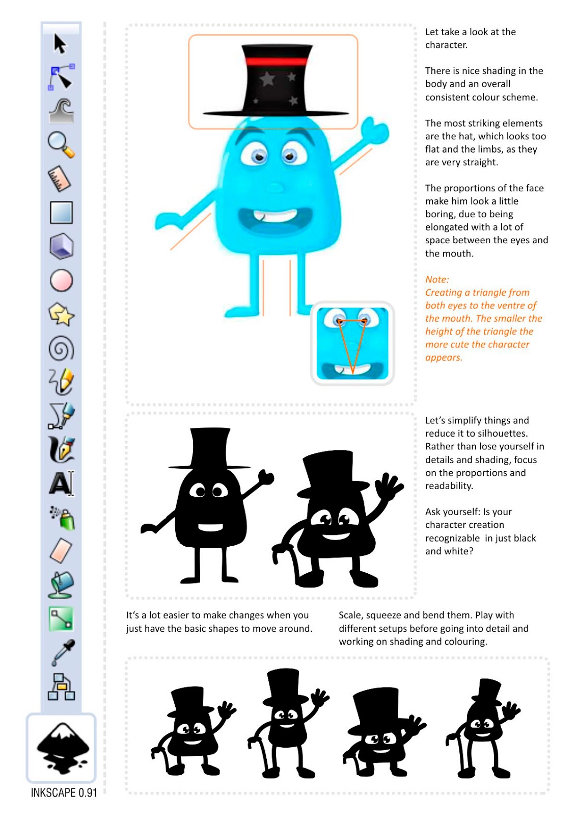 I just had a friend send me his inkscape character design and asking for my opinion. Hadjoudj Mohamed did a good job for an initial design but there are a few easy to avoid beginner problems.